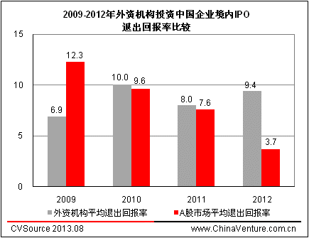 圖5 2009-2012年外資機(jī)構(gòu)投資中國(guó)企業(yè)境內(nèi)IPO退出回報(bào)率比較