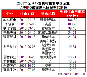 表2 2009年至今外資機(jī)構(gòu)投資中國(guó)企業(yè)A股IPO賬面退出回報(bào)TOP10