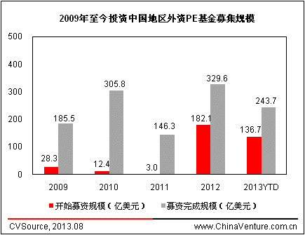 根據(jù)ChinaVenture投中集團(tuán)旗下金融數(shù)據(jù)產(chǎn)品CVSource 統(tǒng)計(jì)顯示,2009-2011年投資中國(guó)地區(qū)的外資PE基金成立數(shù)量和目標(biāo)規(guī)模整體處于較低水平,2012年呈現(xiàn)爆發(fā)式增長(zhǎng),全年共披露20支外資PE基金成立并開(kāi)始募集,總計(jì)目標(biāo)規(guī)模182.1億美元。2013年至今,共披露12支外資PE基金成立并開(kāi)始募集,總計(jì)目標(biāo)規(guī)模136.7億美元,新基金成立仍較為活躍。