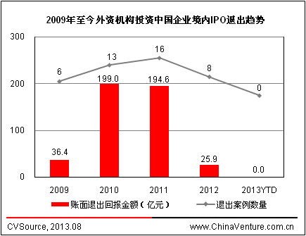 根據(jù)ChinaVenture投中集團(tuán)旗下數(shù)據(jù)產(chǎn)品CVSource統(tǒng)計(jì)顯示,2009-2011年,外資機(jī)構(gòu)投資中國(guó)企業(yè)A股IPO退出案例數(shù)量逐年上升,2011年達(dá)到了16起,創(chuàng)下歷年新高。2010年和2011年累計(jì)賬面退出金額分別為199.0億元、194.6億元。其中,2011年的華銳風(fēng)電,2010年的海普瑞與九州通(兩家加總)為外資機(jī)構(gòu)帶來(lái)的賬面回報(bào)均超過(guò)100億元,在當(dāng)年統(tǒng)計(jì)數(shù)據(jù)中占據(jù)重要地位。2012年以來(lái),在宏觀經(jīng)濟(jì)及資本市場(chǎng)缺乏利好因素的形勢(shì)下,PE市場(chǎng)持續(xù)低迷,退出渠道有所收窄。2012年,外資機(jī)構(gòu)投資中國(guó)企業(yè)A股IPO退出案例僅有8起,累計(jì)實(shí)現(xiàn)賬面退出金額25.9億元,退出案例數(shù)量和退出金額均出現(xiàn)大幅下滑。2013年,A股IPO持續(xù)冰封,沒(méi)有企業(yè)實(shí)現(xiàn)IPO退出(見(jiàn)圖4)。
