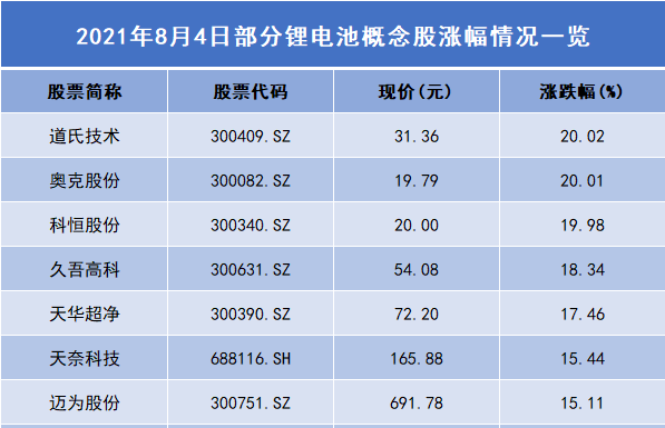 鋰電池板塊上演漲停潮 道氏技術/奧克股份漲幅逾20%