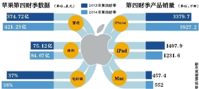 在截至2014年9月27日的第四財(cái)季,蘋果營(yíng)收421億美元,同比去年第四財(cái)季的375億美元上升12%。凈利潤(rùn)84.67億美元,比去年同期的75.12億美元增長(zhǎng)13%。受此消息影響,蘋果股價(jià)昨日大漲2.14%,收盤每股99.76美元。