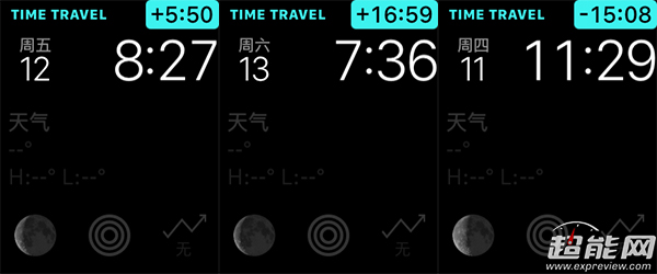 表盤上還有一個新功能,名為Time Travel時間旅行,在擁有小插件的表盤上,只需要旋動數(shù)碼表冠,即可以查看前后共72小時內(nèi)的資訊,包括錯過了的信息、未來的安排和天氣預告等等,再次點擊表冠即可回到現(xiàn)在的時間。