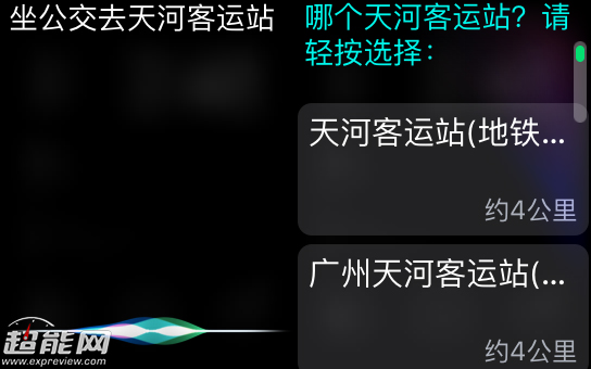 此前Siri最多可以啟動(dòng)某個(gè)應(yīng)用、記錄筆記,或者使用Siri進(jìn)行聽寫單詞輸入,不過(guò)現(xiàn)在可以實(shí)現(xiàn)更多的功能,例如我輸入“坐公交去天河客運(yùn)站”,它就會(huì)彈出幾個(gè)可能要的選項(xiàng),然后繼續(xù)彈出交通工具選項(xiàng),但因?yàn)榍懊嬉呀?jīng)識(shí)別出“坐公交”,所以系統(tǒng)會(huì)自動(dòng)作出選擇。但現(xiàn)在我這邊的地圖數(shù)據(jù)一直無(wú)法同步到手表上,所以沒辦法看到路線。
