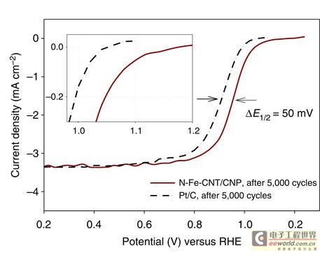 5,000次充放電循環(huán)后,使用新型催化劑和鉑金催化劑的電池中氧化還原反應(yīng)極化對比