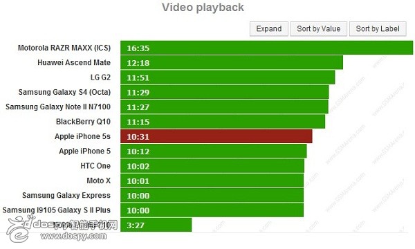 iPhone 5s視頻播放時間為10小時31分,跟上一個環(huán)節(jié)的測試結(jié)果一樣,iPhone 5與iPhone 5s的差距非常小。