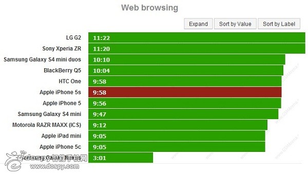 iPhone 5s在Wi-Fi環(huán)境下的網(wǎng)頁瀏覽時間為9小時58分,表現(xiàn)是很不錯的,不過iPhone 5與iPhone 5s的差距僅僅只有2分鐘。