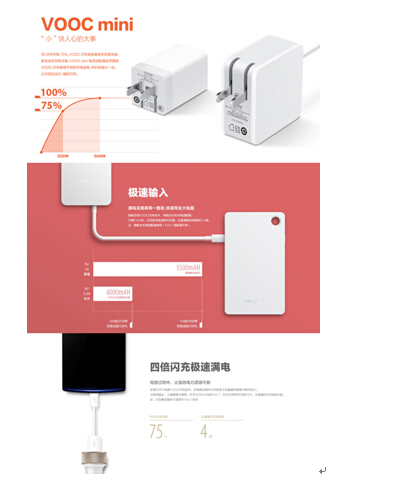VOOC閃充技術已經在OPPO Find 7上成熟應用,容量為3000mAh的電池能實現在30分鐘內充滿75%的電量;充電10分鐘即可支持通話2個小時;比傳統的充電技術提高4倍的充電速度。現在該技術已經升級到VOOC mini,更小更方便攜帶。
