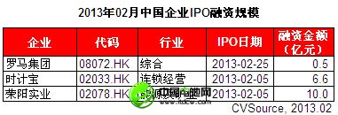 2013年2月上市的3家中國(guó)企業(yè)全部集中于香港資本市場(chǎng),包括廣東省鋁產(chǎn)品制造商榮陽(yáng)實(shí)業(yè)(02078.HK)、香港手表發(fā)展商及零售商時(shí)計(jì)寶(02033.HK)以及向客戶提供評(píng)估及技術(shù)顧問服務(wù)的企業(yè)羅馬集團(tuán)(08072.HK)(見表1)。