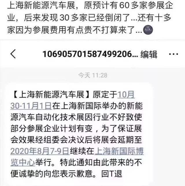 一時間流言四起。網傳的一張短信截圖稱:原定于10月30日—11月1日舉辦的上海新能源汽車自動化技術展,因行業不好致使部分車企計劃有變,延期至2020年8月舉行。