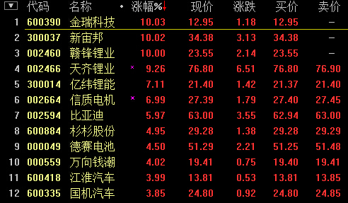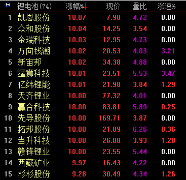 10:14,新能源汽車板塊3.63%,鋰電池板塊漲4.09%,凱恩股份、眾和股份等14股漲停。