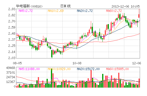 新能源股今日受追捧,其中華電福新(00816)大升7.5%,兼高見2.93元破頂。現漲4.85%,報2.81元。