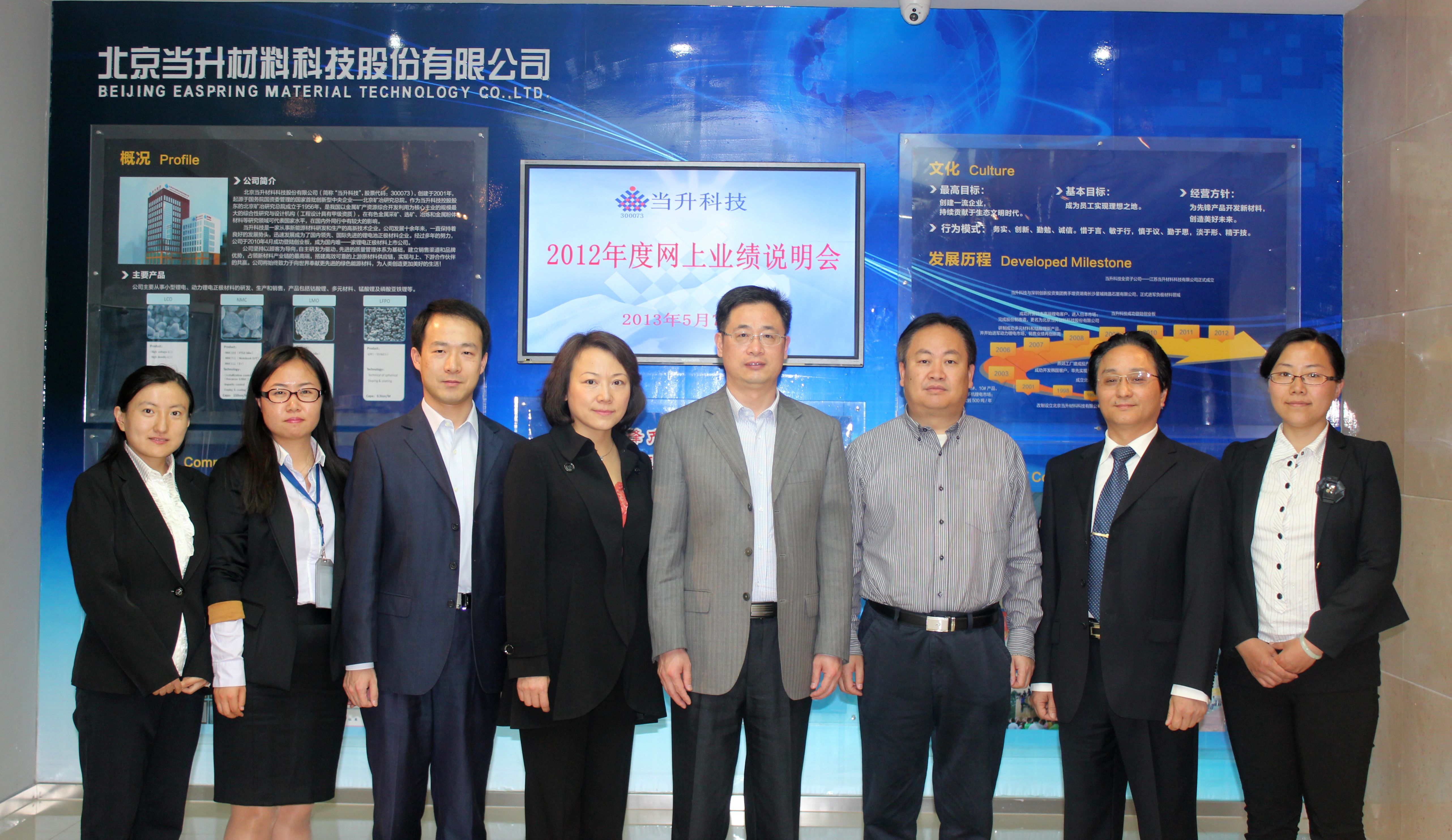 5月7日15時至17時,“當升科技2012年年度報告網(wǎng)上業(yè)績說明會”在深圳證券交易所投資者互動平臺上舉行。當升科技總經(jīng)理李建忠、獨立董事劉洪躍、副總經(jīng)理/董事會秘書曲曉力、財務總監(jiān)黃國泰以及公司保薦代表人劉禹出席了本次說明會。當升科技于2013年4月20日披露了《2012年年度報告》,為了使投資者能夠進一步了解公司的經(jīng)營管理、發(fā)展戰(zhàn)略等情況,舉辦了此次網(wǎng)上業(yè)績說明會,當升科技管理層就大家所關心的問題與投資者進行了在線交流。