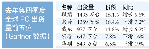 數據顯示,2013年全年全球PC出貨量同比下降10%,創下有史以來最大跌幅。在單個企業的市場份額上,去年第四季度僅有聯想和戴爾的市場份額有所上升,惠普、宏碁、華碩和其他廠商的份額均出現下降。其中宏碁同比下滑16%,華碩同比下滑19%。
