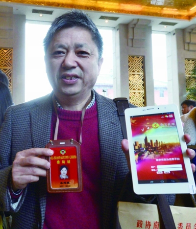 委員報到時間是9:30,不過8:40開始就有委員來到現場了。第一個報到的是金陵中學的朱建廉老師,從事教育工作的他今年帶來了兩個提案,“我建議政府劃撥一個專項經費,用于扶持名師的教育成果轉換,讓名師資源得到更好的管理和使用,發揮更大的輻射作用?!彼⒖ā昂灥健焙?,他拿到了一個檔案袋,里面裝著一支筆、筆記本、一本會議須知和一臺“政協PAD”。
