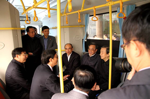 2014年1月9日上午10點,中共中央政治局委員、國務(wù)院副總理馬凱,中共中央政治局委員、廣東省委書記胡春華,國家工信部部長苗圩,廣東省委常委、秘書長林木聲,深圳市市長許勤等首長一行興高采烈地登上五洲龍純電動公交客車。