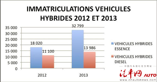 與電動汽車相比,法國混合動力車的銷量更為可觀。2013年,共有46785輛混合動力車在法國注冊,包括32799輛汽油混合動力車及13986輛柴油混合動力車。與2012年的29120輛相比,2013年法國混合動力車銷量增幅達到60%。