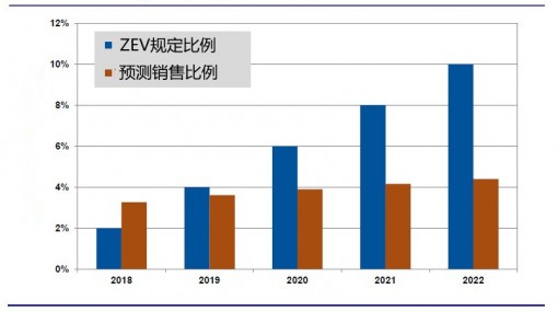 然而,達到上述強制執行的銷售水平的可能性并不大。目前ZEV法案規定的內容是在2008年制定的,以2009年-2017年的車型為對象,要求2018年款電動車型的ZEV最低比例為2%,2022年升至10%,大約是2018年車型的5倍。由于一些車型每次能夠得到不止一個積分,實際產量可能比要求的比例要低。
