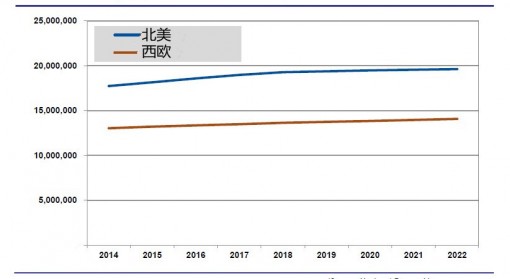 在北美和西歐等成熟汽車市場,新車銷售已經接近峰值。根據Navigant的電動汽車市場預測報告數據,2014年到2022年,所有輕型車輛的復合年均增長率西歐地區每年僅為1%,北美地區每年僅為1.3%。