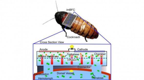 研究團隊所做的就是研發一種可以附著在昆蟲身上的燃料電池,而且由昆蟲自己的體液進行供能。研究人員在昆蟲體內安裝了一個小水槽,其中伴有一種名為海藻糖物質。酶分解海藻糖會產生葡萄糖,從而用于為燃料電池供能。