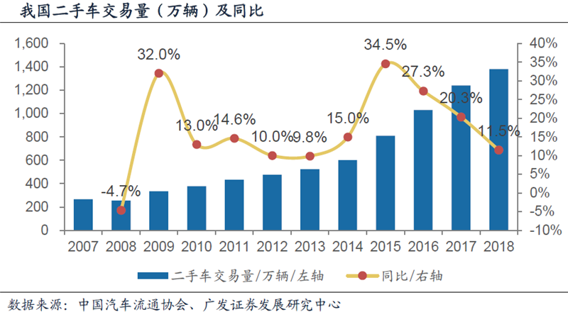 最后,二手車稅費降低及政策支持,發展前景良好。據中國汽車流通協會報道,2018年全國累計完成交易二手車1382.2萬輛,同比增長11.5%,交易金額為8603.6億元。近期,二手車市場增速有所減緩,但仍遠高于行業增速。我國二手車與新車銷量比值僅有0.5,遠低于國際水平,國內市場存在巨大發展空間。本次稅費降低有望促進二手車銷售,后續全額征收改增值征收等政策有望陸續出臺,二手車銷售有望迎來持續快速發展,利好相關經銷商。