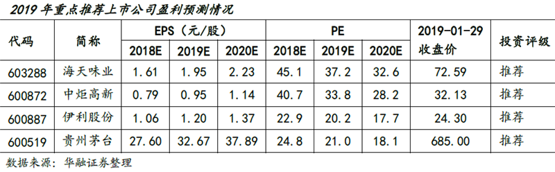 在2019年經(jīng)濟增速放緩預(yù)期下,華融證券看好食品飲料這一防御性板塊的投資機會。自上而下看,建議選擇弱周期性的板塊,如調(diào)味品和乳制品;自下而上看,建議選擇護城河較寬、業(yè)績穩(wěn)定、具有提價能力及品牌稀缺性等特征的標的。建議關(guān)注海天味業(yè)(603288.SH)、中炬高新(600872.SH)、伊利股份(600887.SH)、貴州茅臺(600519.SH)。