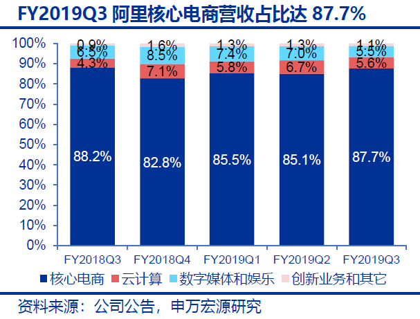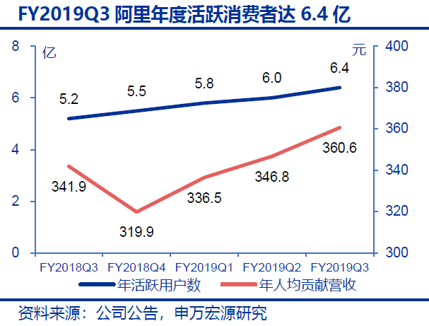 阿里日前公布2019財年第三季度財報,實現(xiàn)營收1172.8億元,同比增長41.3%,其中核心電商業(yè)務(wù)營收1028.4億元,同比增長40.4%,占營收比重87.7%;實現(xiàn)凈利潤309.6億元,同比增長32.7%,增速環(huán)比提升27.9個百分點。國內(nèi)零售平臺月度活躍用戶達到6.99億,環(huán)比凈增加3300萬,截至2018年12月31日止的12個月,年度活躍消費者達6.36億,同比增加3500萬,其中超過70%新增年度活躍消費者來自低線城市。