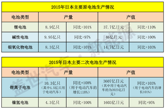 「蓋世汽車·新能源」獨家報道,2015年1-12月,日本電池(包括原電池和二次電池)總產量超過43億只,總產值逾8075億日元(約463億元人民幣),產量和產值與上年同期相比均實現101%的增長幅度。