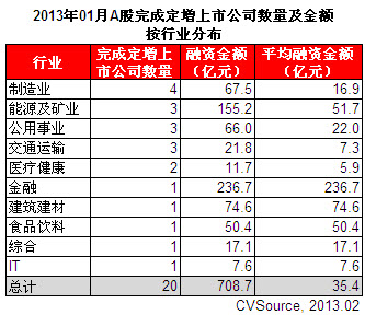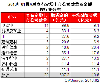 2013年1月,有20家A股上市公司實施了定向增發方案,環比減少25.9%;融資金額總計708.7億元,環比增加45.4%。與此同時,有29家A股上市公司宣布了定向增發預案,環比減少19.4%;預計融資金額總計307.2億元,環比減少31.1%。
