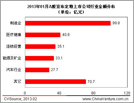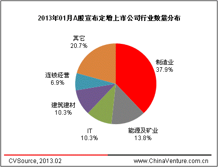 從宣布定向增發預案的上市公司所屬行業上來看,本月29家宣布定增預案的上市公司主要集中在制造業、能源及礦業以及IT、建筑建材等行業。根據ChinaVenture投中集團旗下金融數據產品CVSource統計顯示,2013年1月,共有11家制造業上市公司宣布定增預案,占本月宣布定增上市公司數量的37.9%,融資總額達99.8億元,成為本月預計融資金額最高的行業(見表5,圖4、5)。
