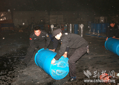 澴城派出所值班民警和聯(lián)勤隊員在全力轉(zhuǎn)運塑料桶裝的易燃物。通訊員 宋俊初 攝