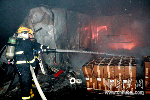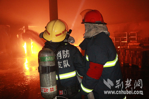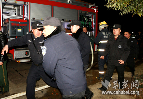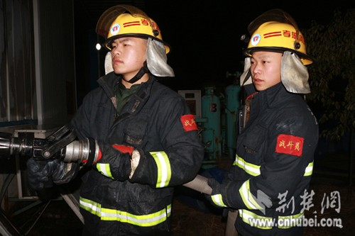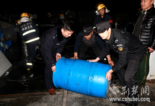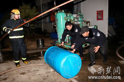 接到報警后,孝昌消防大隊立即出動了3臺水罐車和15名消防隊員趕到現(xiàn)場;孝昌縣澴城派出所值班民警岳星,也帶領(lǐng)8名聯(lián)勤隊員趕到了現(xiàn)場。到達現(xiàn)場后,當(dāng)孝昌消防大隊大隊長錢光輝,了解到該廠倉庫中,堆放著一百多個塑料桶裝的易燃物后,立即指揮消防隊員從廠房西側(cè)和東側(cè)各出2支水槍,全力阻止火勢蔓延;一邊指揮民警和特勤隊員,轉(zhuǎn)移倉庫中堆放的塑料桶裝可燃物;隨后,撥打了孝感市消防支隊和相關(guān)部門的電話,請求援助。