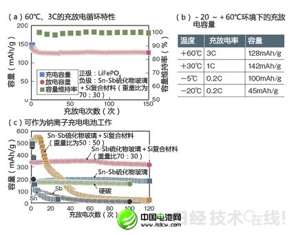 圖19:采用Sn-Sb硫化物玻璃類負極充放電1000次后仍維持了690mAh/g的放電容量 五鈴精工硝子開發(fā)出了經(jīng)過150次循環(huán)充放電后實現(xiàn)99%的容量維持率的鋰離子充電電池(a)。可在-20~+60℃的大溫度范圍內(nèi)使用(b)。特點是負極材料采用了Sn-Sb硫化物玻璃,還可用于鈉離子充電電池(c)。(圖由《日經(jīng)電子》根據(jù)五鈴精工硝子的資料制作) |