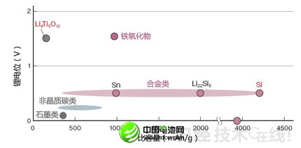 在汽車和定置用途中,目前較受關(guān)注的負極材料為鈦酸鋰(Li4T5O12:以下稱LTO)注14)。LTO的鋰電位高達1.55V左右,鋰不會析出,因此穩(wěn)定性高、壽命長。不過,LTO存在的課題是比容量只有175mAh/g左右。