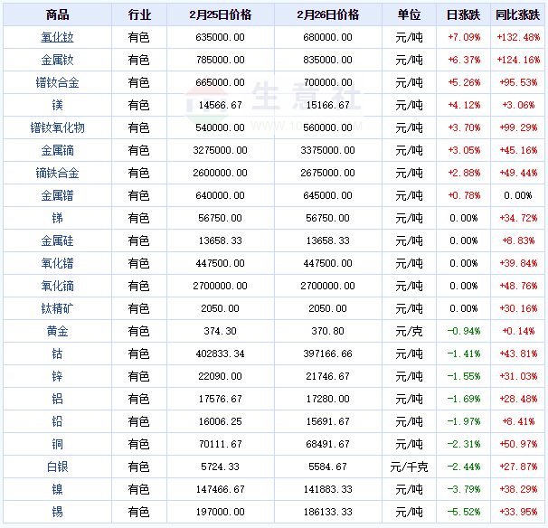 從有色板塊單日漲跌榜可以看出,2021年2月26日大宗商品價格漲跌榜中有色板塊環(huán)比上升的商品共8種,環(huán)比下降的商品共有9種。除稀土產(chǎn)品和鎂外,主要金屬產(chǎn)品均出現(xiàn)不同程度的下跌。鈷受有色板塊下跌拖累,鈷價小幅下跌。宏觀經(jīng)濟基本面仍較為良好,后市鈷市上漲支撐仍存。