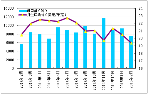 圖1 2014年2月-2015年2月多晶硅進口量及進口均價示意圖數(shù)據(jù)來源:海關(guān)