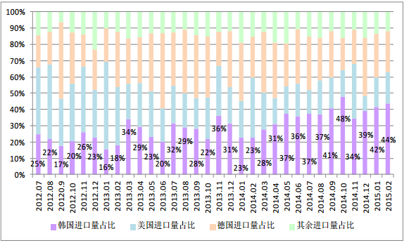 圖2 自韓國進口量占比日漸增加