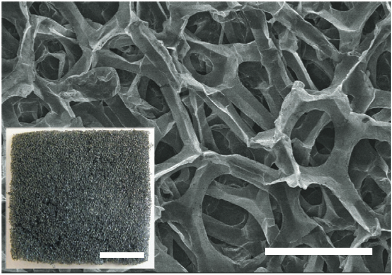 以泡沫鎳為模板,研究者先用化學氣相沉積法在它的表面沉積上石墨,再覆蓋上一層聚合物PMMA;接著用相應溶劑將泡沫鎳和PMMA相繼溶解,得到三維結構的