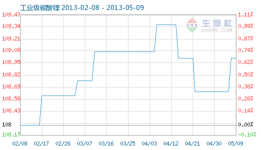 5月9日工業級碳酸鋰商品指數為109.01,與昨日持平,較周期內最高點112.10點(2012-11-04)下降了2.76%,較2012年01月05日最低點98.94點上漲了10.18%。