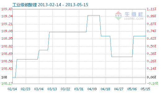 5月15日工業級碳酸鋰商品指數為109.01,與昨日持平,較周期內最高點112.10點(2012-11-04)下降了2.76%,較2012年01月05日最低點98.94點上漲了10.18%。 工業級碳酸鋰商品指數自2013-5-6起,10天陸續上漲了