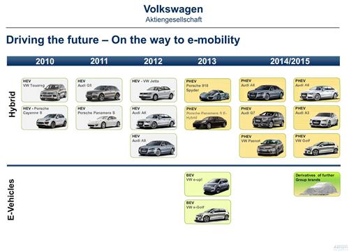 2014至2015年,大眾汽車將發布6款以上電動車。本次披露的6款車型均為插電式混合動力車。大眾品牌為帕薩特PHEV和高爾夫PHEV,奧迪品牌為奧迪A3) PHEV、奧迪A6PHEV、奧迪A8 PHEV和奧迪Q7PHEV。另外大眾屆時還可能推出更多衍生款新能源車。