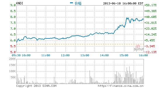 北京時間6月11日凌晨消息 康迪車業(KNDI)周一暴漲38%,自6月5日以來,該股已經上漲了100%。 截至美股收盤,康迪車業(KNDI)上漲38.31%,至7.87美元,道指下跌0.06%。 6月5日,康迪車業稱,由該公司與