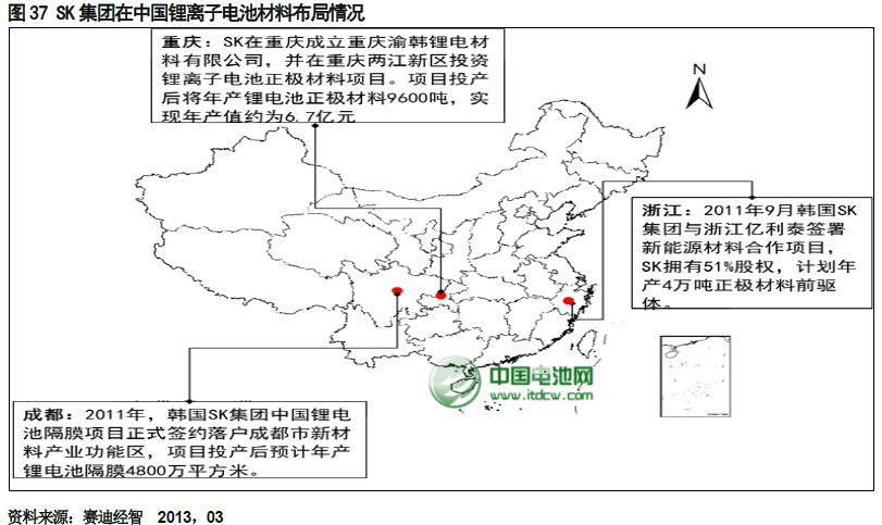 在中國電池材料的區域布局上,SK 集團看中了成都和重慶地處西部所帶來的產業轉移機會,并充分利用中央在中西部的優惠政策,將其隔膜和正極材料項目分別投資在成都和重慶,分享中國政策紅利。另外,在投資思路上,SK 在投資正極材料和隔膜的基礎上,以產業鏈的思維向上延伸到正極材料前驅體,通過收購的方式獲取了浙江億利泰51%的股權。SK 集團在中國以產業鏈的思維整合中國電池材料產業,未來,SK 將繼續在動力電池材料產業鏈領域展開中國國內投資與布局。