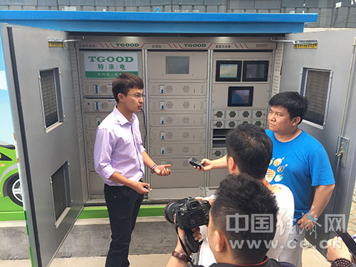 青島特銳德電器股份有限公司的工作人員向“互聯網+在山東”全國網絡媒體采訪采風團介紹汽車群充電系統結構。中國經濟網記者李焱 攝