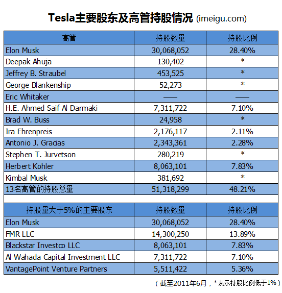 董事長、CEO兼產(chǎn)品架構(gòu)師Elon Musk是Tesla的最大股東,他持有30,068,052股普通股,持股比例為28.40%。董事、薪酬委員會主席、提名及公司治理委員會主席Ira Ehrenpreis代表Technology Partners Fund VIII行使公司2.11%的股權(quán)。Antonio J. Gracias代表Valor基金管理公司行使2.28%的股權(quán),他擁有豐富的運營管理和供應鏈優(yōu)化經(jīng)驗,2010年9月開始兼任Tesla的首席獨立董事。