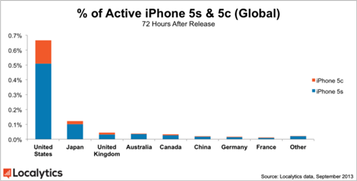 分析方法:“Localytics是全球領(lǐng)先的、專注于移動(dòng)和網(wǎng)絡(luò)應(yīng)用的分析營(yíng)銷平臺(tái),覆蓋超過10億臺(tái)設(shè)備、20,000個(gè)應(yīng)用程序和5,000家客戶。Localytics每月處理500億數(shù)據(jù)點(diǎn)。對(duì)于這項(xiàng)研究,我們調(diào)查了全球2,000萬臺(tái)唯一iPhone手機(jī),并按國(guó)家進(jìn)行細(xì)分。研究時(shí)間段是從2013年9月20日iPhone 5S和iPhone 5C開售至本周一,即2013年9月23日。”