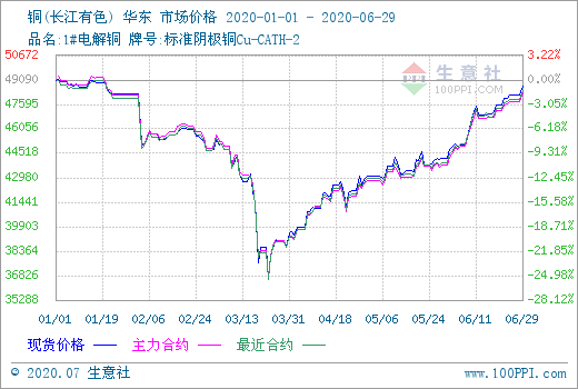如上圖顯示,2020年上半年,銅市先下跌后上揚,走出“深V”走勢,據生意社數據監測,年初銅價49033.33元/噸,隨后跌至半年最低點3月23日的36560元/噸,跌幅達25.44%,然后一路反彈至6月底的48166.67元/噸,幾乎完全收復之前跌幅,較年初只小幅下跌1.77%。