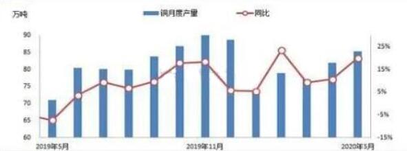 據上表所示,疫情當前,南美地區受到病毒侵襲,進出口受阻的情況下,個別月份出現同比下滑,但中國銅礦砂進口量整達變化不大,2019年2202萬噸,較2018年增加230萬噸,同比增加11.66%。2020年1-5月,中國銅礦砂進口總量為926.8萬噸,同比增加14.77%。