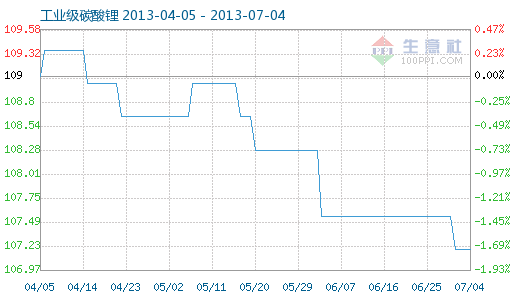 7月4日工業(yè)級(jí)碳酸鋰商品指數(shù)為107.19,與昨日持平,較周期內(nèi)最高點(diǎn)112.10點(diǎn)(2012-11-04)下降了4.38%,較2012年01月05日最低點(diǎn)98.94點(diǎn)上漲了8.34%。(注:周期指2011-09-01至今)