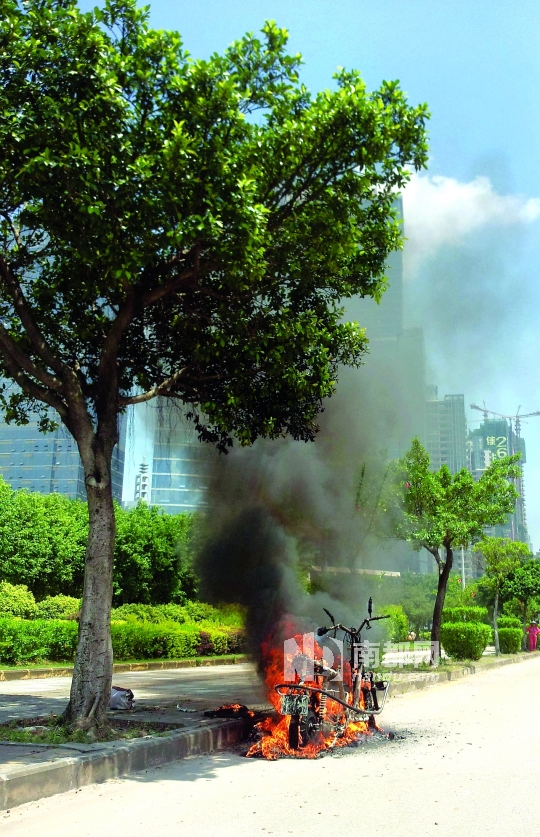 車主余小姐表示,當時她正驅車上班,行車到事發處附近時突然熄火。她聞到一股焦味,低頭一看,電動車電池盒開始冒煙。見勢不妙,余小姐下車推行,“剛推出十來米,車上就冒出了火苗。”情急之下,余小姐取下身上的防曬衣開始撲火,但與事無補,只好取走手機錢包等貴重物品躲到一旁。